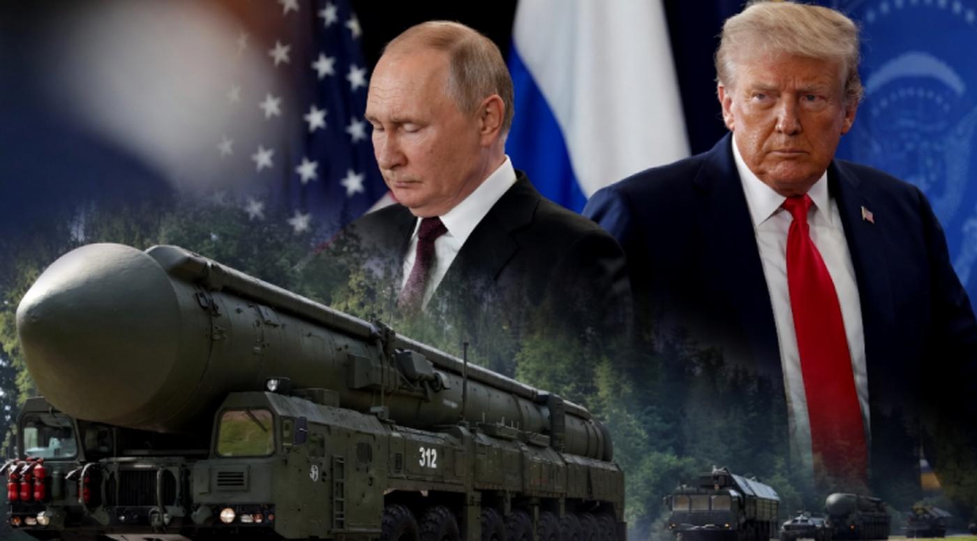 vladimir Putin and Donald Trump with Russian nuclear missile launcher marked 312 and
