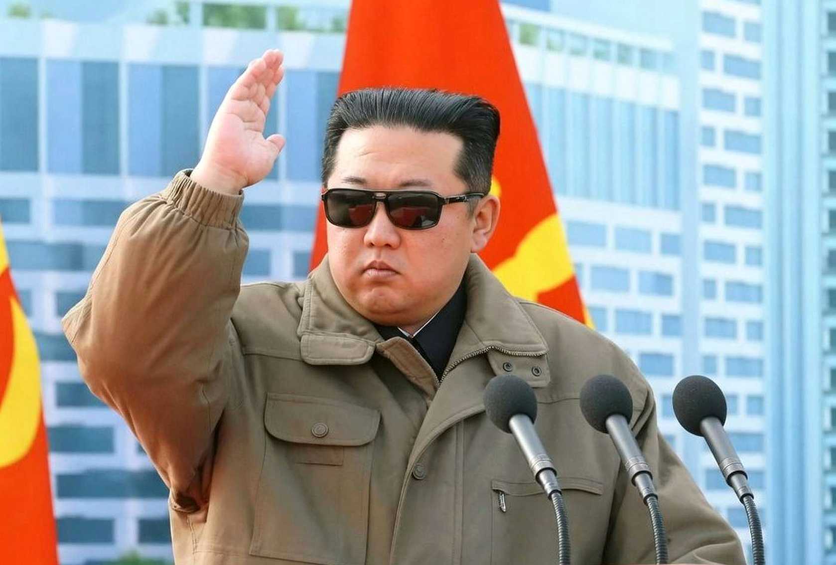 kim Jong Un wearing sunglasses and a tan jacket raises his hand while speaking at a