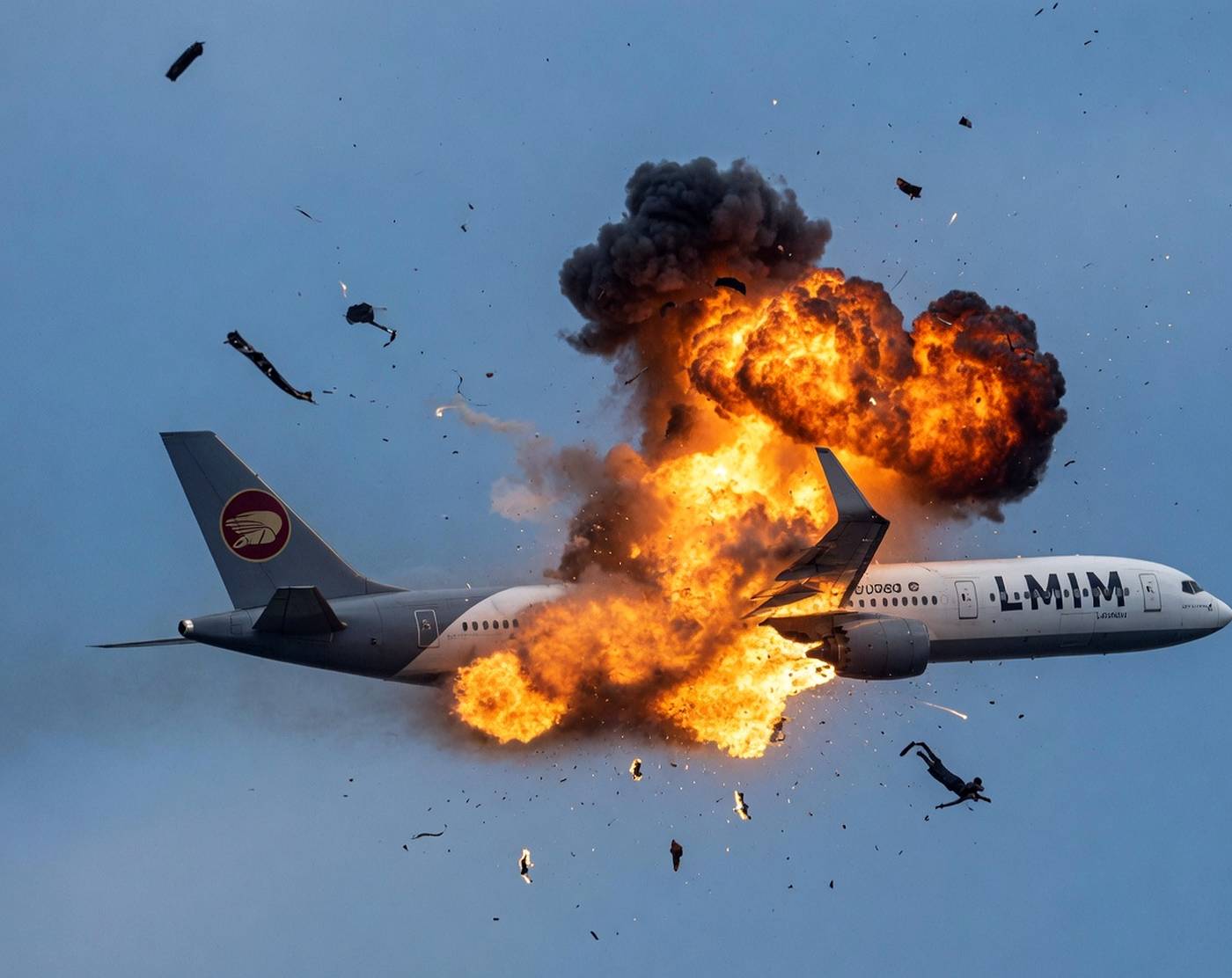 commercial jet with LMIM livery explodes mid-air, sending debris and flames across clear