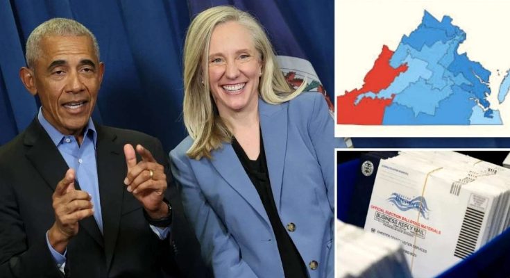 barack Obama gestures beside smiling woman in blue blazer, Virginia district map and mail