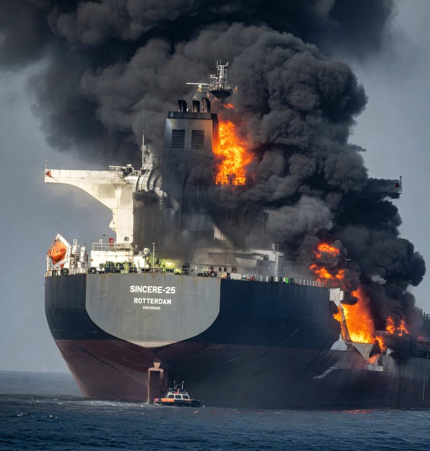 large cargo ship named SINCERE-25 Rotterdam engulfed in flames with thick black smoke